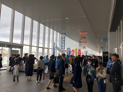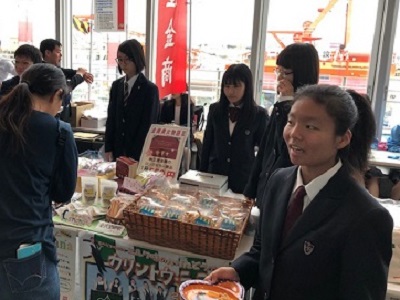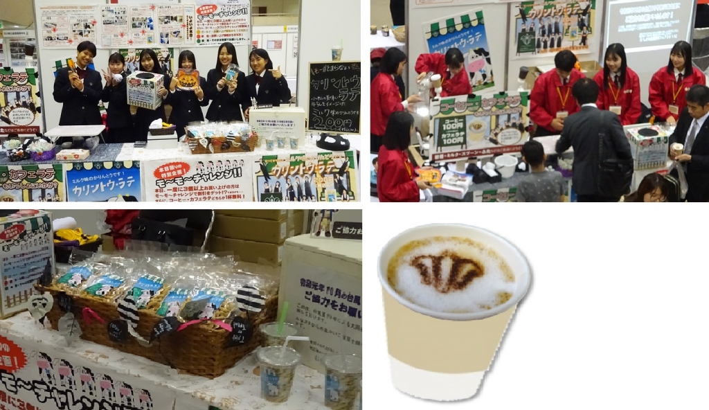 新潟県で開催された全国産業教育フェアに参加し、10月26日(土)に会場の朱鷺メッセ内の全国高校生デパートのコーナーで、今年度の開発商品「カリントウ・ラテ」を販売してきました。会場には、多くの方々が来場していて、大変賑わっていました。