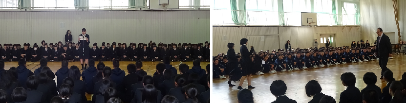 新2,3年生の在校生と新入生との顔合わせをしました。生徒会長の中川くん、新入生代表の前野さんの挨拶の後、運動部の生徒達による学校生活等のマナーパフォーマンス(寸劇?)を披露しました。