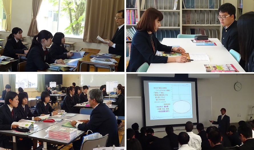 ※本日、キャリア教育の一環として3年生の進学希望者を対象に、「進路学校説明会」が行われ、県内外から約20校の大学・短大・各種専門学校の方々にお越し頂きました。生徒達は各教室(ブース)を回り、説明を聞いたり質問をしたりと、とても有意義な時間を過ごしました。また、就職希望者は、履歴書の作成やこれから始まる就職活動の対策について研究・学習しました。各校の関係者のみなさん、本日は有り難うございました。