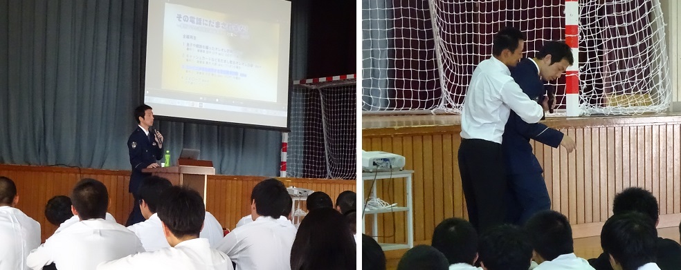 ※例年行われている防犯教室が、本日、小松警察署より畝村様に起こしいただき実施されました。生徒達はSNSによる危険性やネット犯罪に巻き込まれないための心構えなどを知るとともに、不審者への対処法など実演をまじえて学びました。
