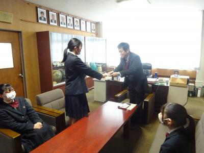 校長室にて、2月9日より始まる全商北信越地区競技大会(福井県)に出場する部活動の激励会を行いました。顧問が見守る中、各部の代表選手は、強い決意を述べていました。健闘を祈ります。応援よろしくお願いします。