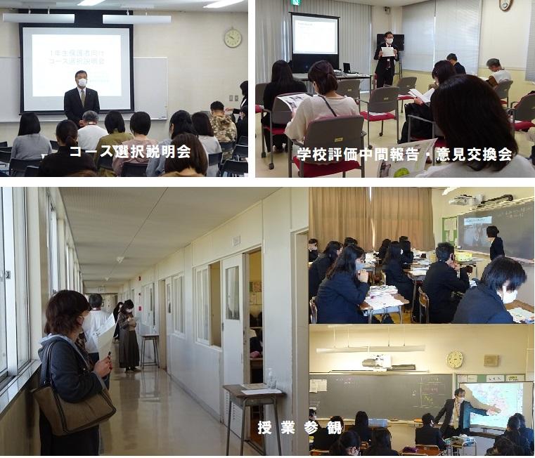本日、11月3日(火・祝)は、授業参観に加えて、「学校評価中間報告・意見交換会」や1年生の保護者を対象とした「コース選択説明会」が行われました。