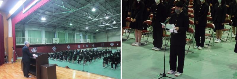 続いて始業式をおこないました。校長先生からは3つのお願いがありました。1つ目は「挨拶」、2つ目は「整える」、3つ目は「自分のやってきたことを語れるように」ということでした。生徒の皆さん、今日のお話をふまえて、学校生活の良いスタートをきりましょう。なお、4月11日(月)は進路実力試験です。準備をして臨みましょう!!