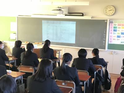 ②女子高生のネットトラブルの一例をDVDで視聴し、SNS上の注意点を考えました。他人を気づつけないことや個人情報をネット上に安易に載せないことなどを考えることができました。