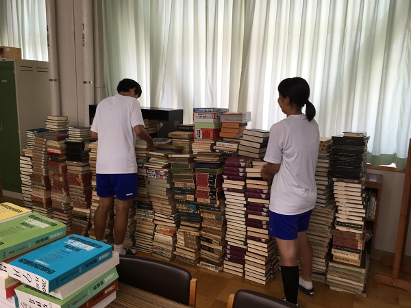 7月19日(木)、図書委員が吹奏楽部部室兼書庫にて