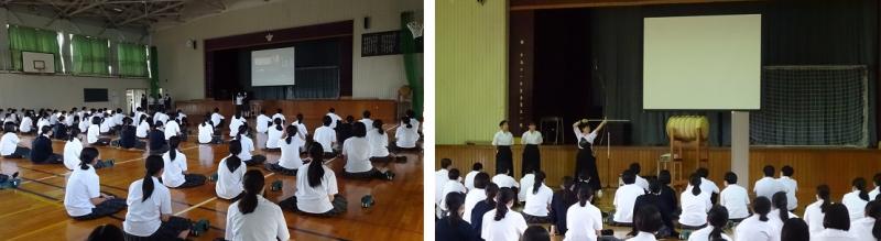 ※本日、小松警察署より2名の方にお越しいただき、令和2年度の防犯教室が行われました。ネット犯罪や振り込め詐欺の受け子のアルバイト等、大麻などの薬物にまつわる様々な危険性について事例を交えながらお話いただきました。また、護身術を実演しながら説明していただきました。今回は生徒同士での実践はできませんでしたが、生徒たちは、真剣に話に耳を傾けていました。