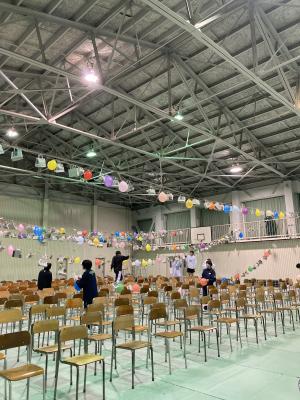 明日の文化祭のために、数日前から全校生徒で準備をしてきました。いよいよ明日が本番です。体育館は全校生徒で作った新聞バッグが一面に飾られています。3年生課題研究班の作業をバスケ部が引き継ぎ、夜遅くまで手伝ってくれました。明日、お楽しみに♪( ´θ`)ノ