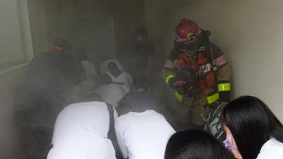 その後、教室へ戻るときに1クラスずつ煙体験をしました。煙が充満している中を、身をかがめて出口を探して進むことがいかに難しいか、体験できました。本当の火災に遭わないほうがいいのですが、もしもの時には今日のことを思い出して行動してほしいものです。消防隊の皆さん、救急隊の皆さん、お忙しい中ありがとうございました。