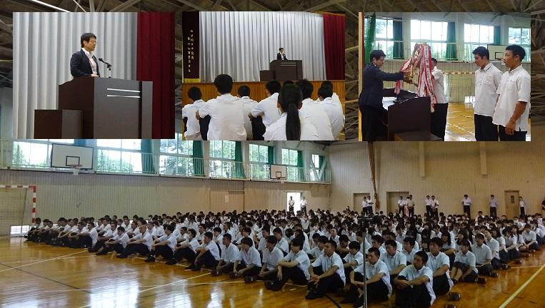 ※夏休みも終わりいよいよ本日より2学期がスタートしました。授業の前(1限目)に始業式が行われ、南校長より「休み明けは何かとしんどいかもしれませんが努めて笑顔で過ごしてください。辛いときは勇気を出して誰かに伝え、相談された人は親身になって話を聴いてください。そして落ち着いたら信頼できる大人に話してください。」とゲートキーパーについてお話しいただきました。また、今夏の全国PTA連合大会(茨城)での第72代横綱・稀勢の里関の講演についても触れ、自らが学びに向かい主体的に学ぶことの大切さをお話しいただきました。