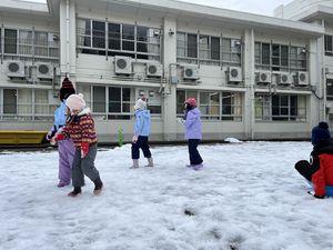 1月16日に中庭で雪遊びをしました。待ちに待った雪遊び! 友達と雪玉を投げ合ったりそり滑りをしたりして、みんな元気いっぱい楽しみました。