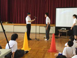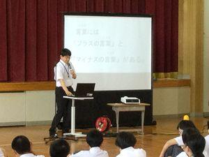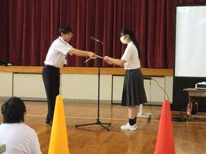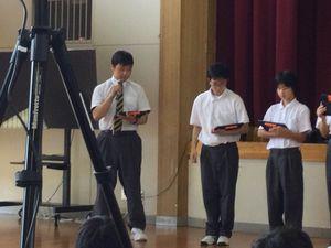 生徒会役員より夏休みの生活について話があり、役員一人一人が分かりやすく伝えていました。「2学期に元気に会いましょう」としめくくりました。
