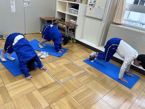 2年生のおはようひろばでは、音楽に合わせていろいろな歩き方をしています。みんなで手をつないで歩いた後、「いぬさん歩き」「くまさん歩き」「かにさん歩き」など動物の歩き方を真似て楽しんで体を動かしています。