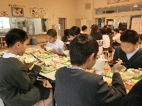 いつもは学年ごとに座って食べていますが、なかよし給食の時には縦割り班で食べます。
