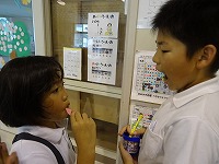 鵠巣小学校では、毎月はみがき強化週間に「たてわりチェック」や「たんにんチェック」をしています。今日は、「たてわりチェック」で違う学年の友だちに口の中をチェックしてもらいました。