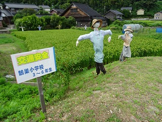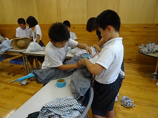 田植えをした田んぼに鳥などが来ないようにするために、かかしを作りました。