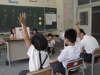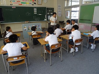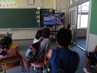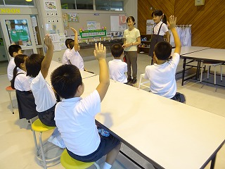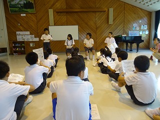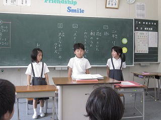 2年生が1年生や他のクラスの児童に国語の発表とクイズをしました。