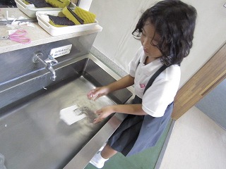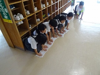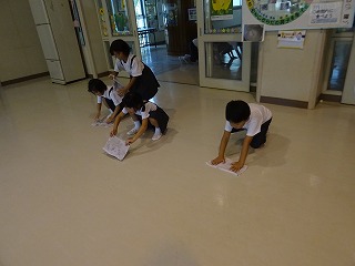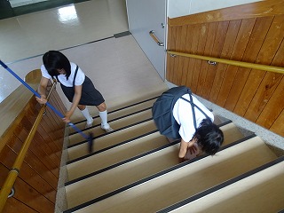 1年生は、初めて教室以外の場所でした。5年生が上手に教えてくれて、一生懸命階段掃除をしています。「そうじ、楽しい!」と言っていました。