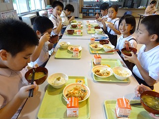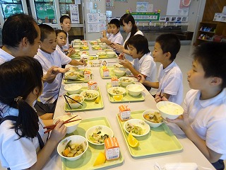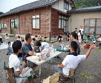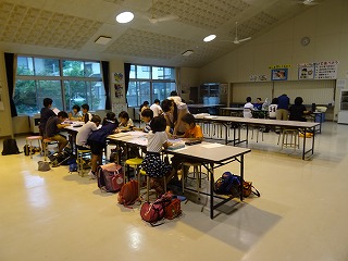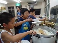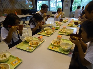 公民館合宿で作ったカレーを小学校の職員も一緒にいただきにいきました。