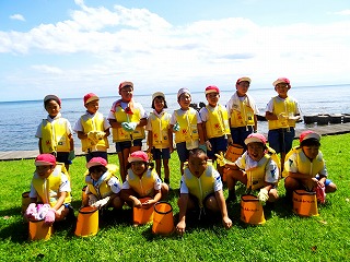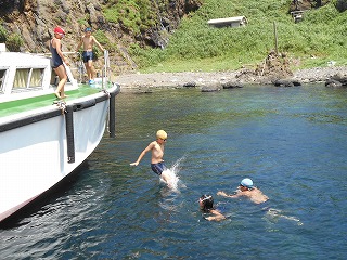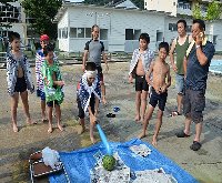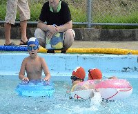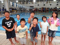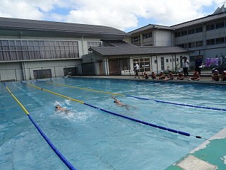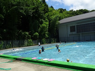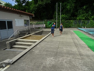 その後、海水浴を予定していましたが、波が高く危険ということで、急遽町野小学校のプールを貸していただき、水遊びを楽しみました。普段使っている学校のプールに比べ大きく深いプールに驚いていました。