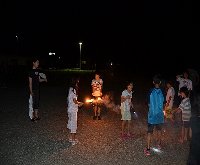 体験実習館に戻り、テントを立てた後、お風呂に入りました。子ども同士で入ったお風呂も、とても楽しかったようです、お風呂のあとはお楽しみの、夕食。お母さん方が作ったカレーライスと、お父さん方が焼いた焼き鳥やフランクフルトをほおばり、おなかいっぱいになっていました。