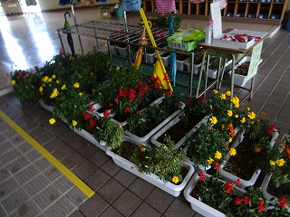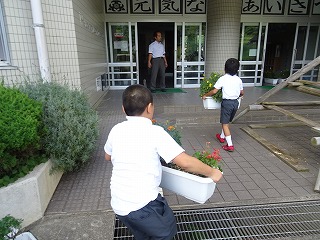 台風の危険が迫っているので、1・2年生がプランタを安全な場所に運んでくれました。