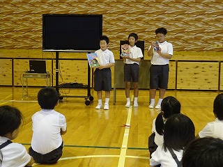 図書委員会の発表では、多読賞の表彰やおすすめの本の紹介、紙芝居がありました。