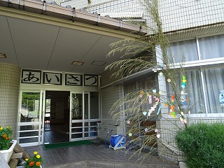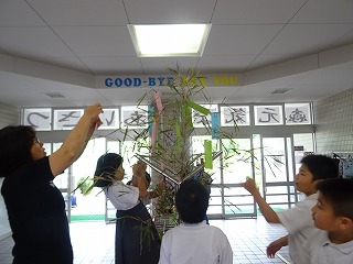 鵠巣小学校の玄関には、七夕に向けて願い事や七夕飾りが飾られています。