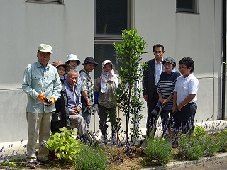 平成29年度6年生が手伝い、一緒に鵠巣小学校の体育館玄関前に月桂樹とライラックの苗木を植樹しました。