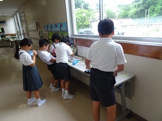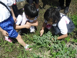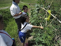 昼休み、1・2年生は運動場で虫さがしをしたり、野菜の収穫をしたりしています。