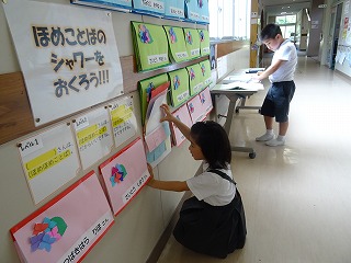 水曜日のあじさいタイムに書いたほめ言葉を1・2年生にみんなでかけました。