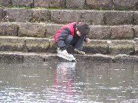 学校で育てていたヤマメの卵が孵化し、児童代表が三角州へ行き、ヤマメを放流しました。
