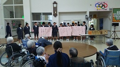 先月体験農園で収穫したサツマイモと歌のプレゼントを持って、百寿苑を訪問して来ました。おじいちゃんおばあちゃんから、たくさんの拍手をいただきました。