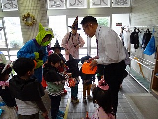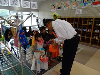 「とりっく おあ とりーと!おかしをくれないと いたずらしちゃうぞ!」と可愛く言って、校長先生からおかしをもらっていました。