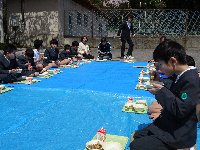 今日の給食は、満開の桜の木の下でお花見給食でした。