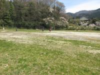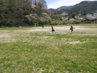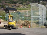 運動場の様子はというと、パワーショベルが新たに一台やってきました。集めた土砂を撤去するためでしょうか。(臨時休校中にイノシシに掘り起こされた運動場の整地が行われています)