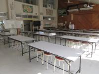 臨時休校中ですが、学校に来ている子どもたちは、午後2時まで、ランチルームで基本の日課に沿って学習をして過ごしています。机の間隔をあけて密を避けるように注意しています。