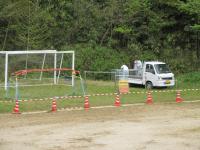 運動場の整地とは別に、市の教育委員会が手配してくださり、なんと、イノシシ捕獲用の檻が設置されました。う~ん、なかなかに大きく本格的です。実際、学校職員の中で、イノシシの姿を、運動場で見かけたことは誰もいないですが、運動場には複数の足跡や掘り起こした跡があります。今回檻を仕掛けた場所にも、山中に続く足跡がある場所で、イノシシの通り道と思われるところだそうです。早く子どもたちが安心して遊ぶことができるようになってほしいですね。