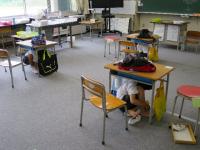 一つ目は、「シェイクアウトいしかわ」への参加です。11時の輪島市の防災無線放送を合図に、子ども達は「姿勢を低くして、頭を守り、動かない」という3つの行動を即座に実行していました。