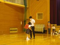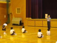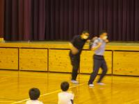 二つ目は、「不審者対応防犯訓練」です。体育館で不審者に遭遇した場合の危険回避の訓練を行いました。「自分の身を守る」ために、ランドセルを投げ、大きな声を出して逃げることを体験を通して学びました。