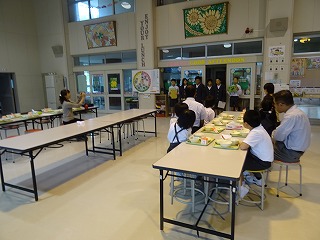 先日収穫させていただいたさつまいもを給食に使ってもらいたくて持っていきました。5人で380人分も作っていることや鍋の大きさにびっくりしていました。