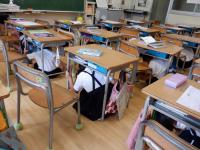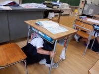 7月8日(金)はシェイクアウトいしかわの日です。シェイクアウトいしかわとは県民一斉防災訓練のことで、学校や保育所、企業などが参加します。本校は午前11時に緊急地震速報の放送を流し、子どもたちはしっかり放送を聞いて机の下に隠れ、頭を守りました。プールの授業をしていたクラスはプールサイドに上がり、担任の指示に従いました。写真のクラスは2年1組です。子どもたちは揺れが収まるのを待っています。最近、能登地方の地震が活発になっているようですが、白山市でも安心はできません。自分で自分の身を守る方法を考えて過ごしましょう。