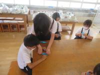 ①算数の学習では、3つの数の計算を学習しました。初めての3つの数の計算でしたが、「数字が3つある!」、「足し算と引き算が混ざっている」など、楽しそうに学習に取り組んでいる姿が見られました。算数のクジラノートに、課題を書いたり、自分の考えを書いたりすることもだんだんと上手になってきました。また、各クラス計算練習も頑張っています。これから、繰り上がりの足し算引き算の学習に入ります。計算カードの宿題も出ますので、声掛けをよろしくお願いします。
