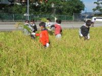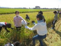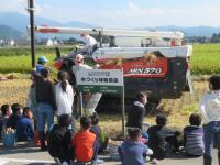9月14日(水)5年生が稲刈り体験をしました。子どもたちは長袖長ズボン長靴姿で黄金に実った田んぼに入り、収穫をしました。田んぼの先生織田さんら6名の指導を受け、鎌を手に稲を刈りました。根元をしっかり持ってザクザクと切っていました。収穫した稲を積み上げて、最後はコンバインで脱穀です。昔は波佐にかけ、乾燥させてから脱穀したものですが、今はコンバインで収穫から脱穀まですべて完了するところが時の進化を感じます。田植えをして約4か月。どんなお米になるか楽しみですね。
