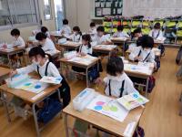 ②図工の学習では、4つの風船に好きな色を塗りました。はみ出さないように慎重に塗っている姿が見られました。絵具の準備や片付けも上手になってきました。来週から、読書感想画の学習が始まります。「てぶくろ」というお話を聞いて、大きな画用紙に絵を描いていきます。
