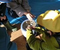 洗濯板での洗濯体験では、昔の洗濯の大変さを感じながらも楽しんで体験をしていました。