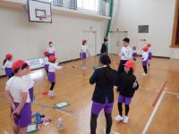 6年生は1年生の跳び方を見て、お手本を見せたり、声掛けをしながらなわとびのこつを丁寧に伝えている姿が見られました。