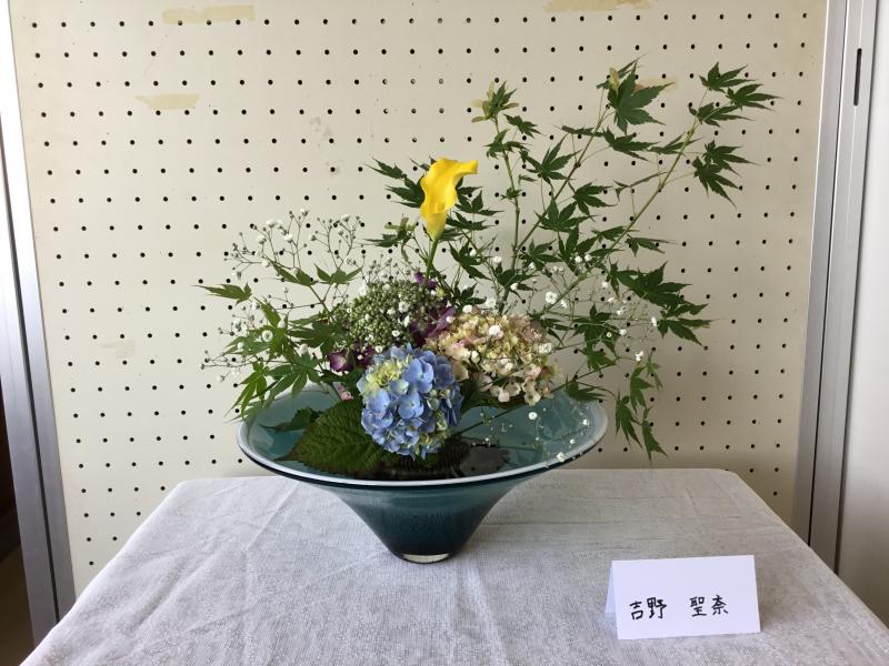 花材はりんどうやきりふき草などで、夏らしく涼やかな作品になりました。