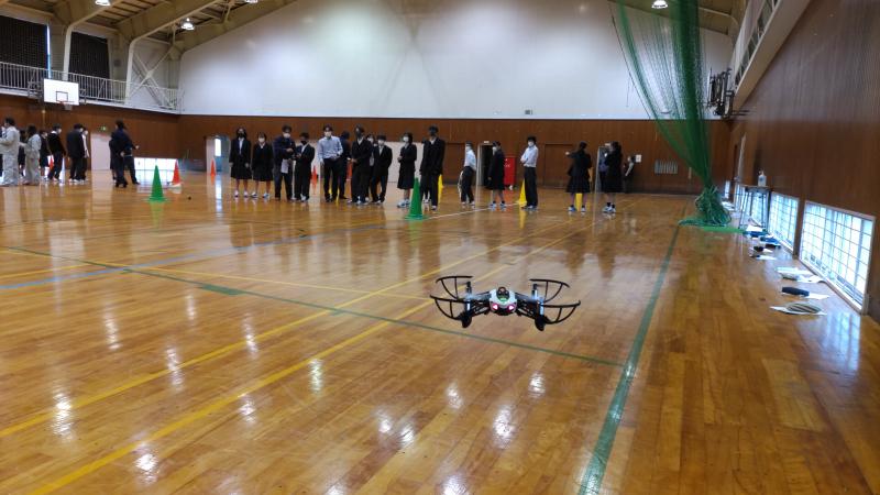 また、お話を聞いた後、体育館に移動してドローンの操作体験もさせていただきました。最初は思うように操作できなかった生徒も、各会社の社員の方々から丁寧に教えていただき上手に動かすことができました。最後に、若い社員の方々に仕事のやりがいなど聞くことができてよかったです。