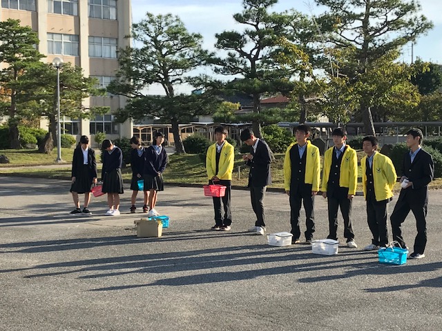 5月24日(水)本校の校門周辺にて「ヤングイーグル隊」活動を本校公安委員とバドミントン部と教職員等の約20名が参加しました。金沢東警察署の警察官の方と一緒に自転車マナーについて呼びかけを行い、自転車に乗ってきた生徒には、自転車に反射材の取り付け、ヘルメット着用の啓発チラシの配布を行いました。