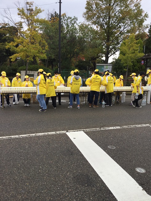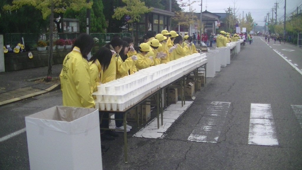 1万3000人のランナーが通り過ぎました。写真にはありませんが、道がランナーであふれていました。給水でお礼を言ってくれるランナー、仮装しているランナー、秋の雨の中、金沢向陽高校のボランティアはよくがんばってくれました。